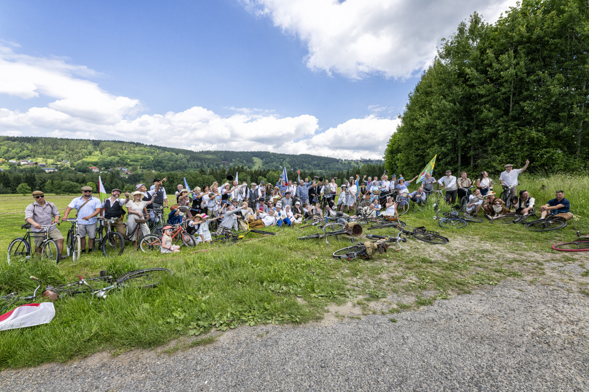 Neděle přinesla pěkné počasí, což ocenili všichni startující bicyklisté na historických strojích u penzionu Rusalka v Navarově. V úvodním projevu zveřejnil Fr. Cvan svůj objev v dobovém francouzském tisku, jak česká hlava přispěla k olympijské tradici běhu s pochodní. Byl to nápad Járy Cimrmana, který psal Pierru de Coubertinovi, že běhá s loučí pro křesadlo do vedlejší vesnice. Moderní olympijské hry ji převzaly před sto lety, aniž by český nápad ocenili…