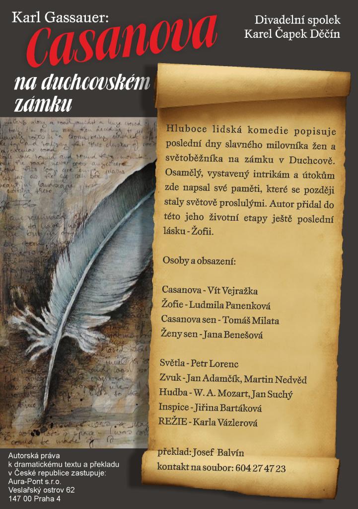 Divadelní spolek Karel Čapek Děčín představuje představení ' Casanova na duchcovském zámku '. Toto dílo popisuje poslední dny slavného milovníka žen, Casanovy, na zámku v Duchcově. V inscenaci hrají Vít Vejražka, Ludmila Panenková, Tomáš Milata a Jana Benešová. Režie se ujala Karla Vázlerová a hudbu složil W. A. Mozart. Přijďte si užít tuto jedinečnou divadelní zkušenost.