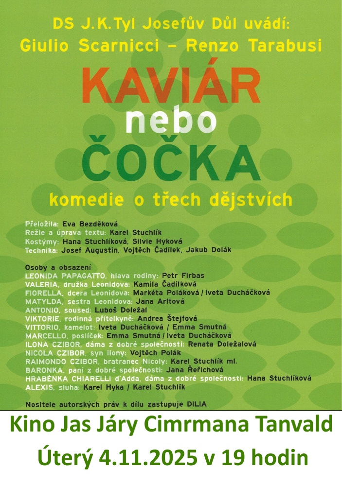 DS J.K. Tyl Josefův Důl uvede slavnou situační komedii Kaviár nebo čočka italských autorů G. Scarnicciho a R. Tarabusiho.