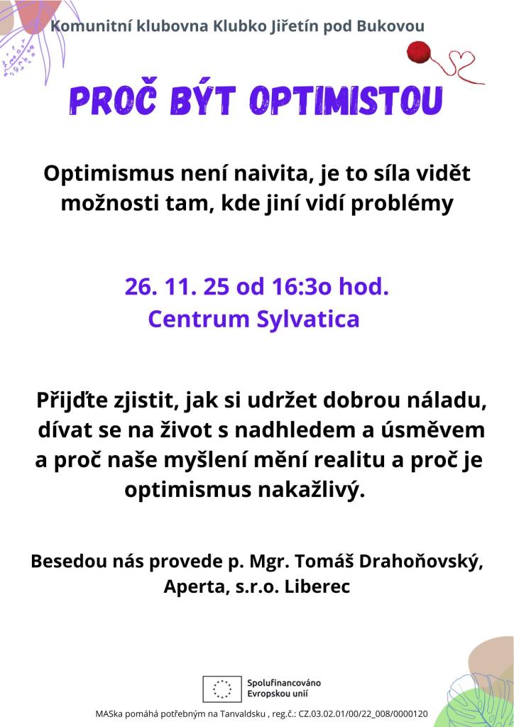 Přijďte na besedu s Mgr. Tomášem Drahoňovským, kde se dozvíte, jak si udržet dobrou náladu a optimistický pohled na život. Diskuze proběhne v komunitní klubovně Klubko v Jiřetíně pod Bukovou. Téma se zaměří na to, jak myšlení ovlivňuje naši realitu a proč je optimismus nakažlivý. Nenechte si ujít tuto příležitost pro inspiraci a povzbuzení.