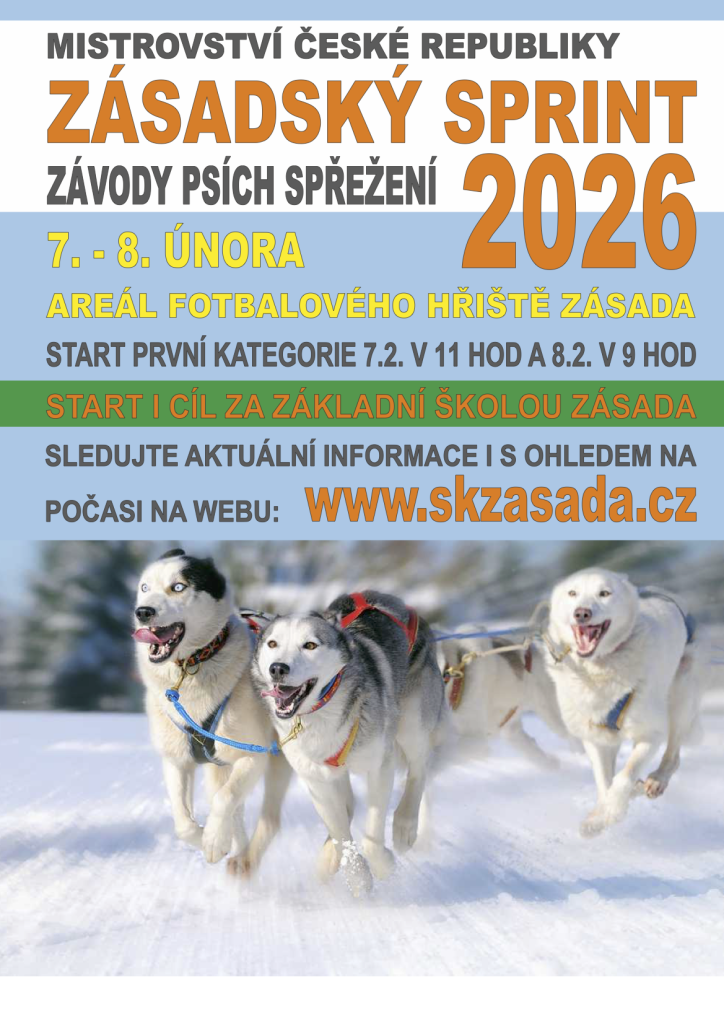 Mistrovství České republiky v závodech psích spřežení, známé jako Zásadský sprint, proběhne ve dnech 7. a 8. února 2026. Akce se koná v areálu fotbalového hřiště v Zásadě. První kategorie závodu odstartuje 7. února v 11:00 a druhý den, 8. února, v 9:00. Nezapomeňte sledovat aktuální informace o závo