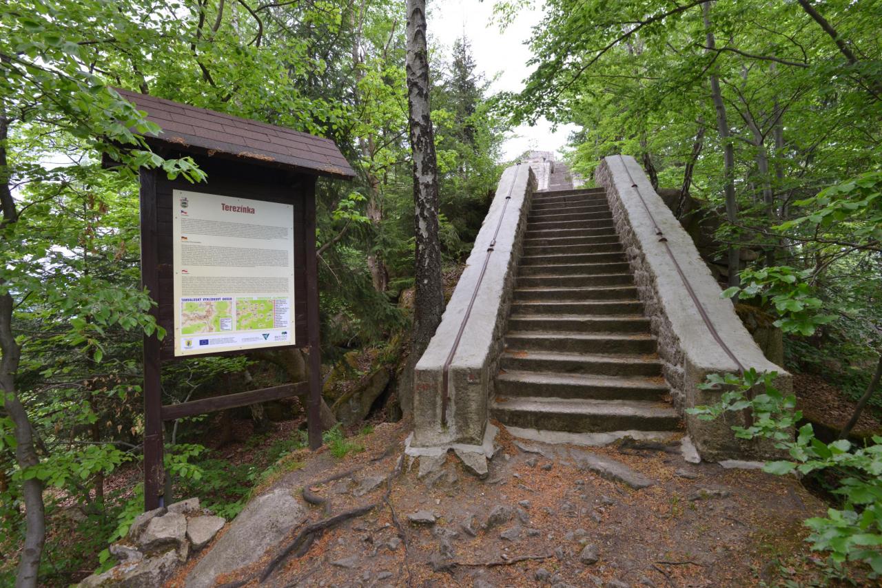 Projdeme ještě rozsedlinou Skalní brány a před námi je další z pozoruhodností Černostudničního hřebene - vyhlídka Terezínka. Již v roce 1853 tady nechal vídeňský průmyslník a majitel tanvaldské přádelny Johann Mayer vybudovat mohutnou podezdívku ze stovek žulových kvádrů, na jejíž koruně vznikla rozsáhlá plošina. Pro bezpečnost návštěvníků byla obehnána masivním kamenným zábradlím a pro případ náhlé nepohody zde bylo postaveno i jednoduché přístřeší. V názvu vyhlídky zvěčnil Mayer jméno své manželky, když ji pojmenoval Theresienhöhe, tedy Terezina výšina.