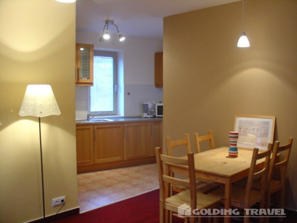 V každém z apartmánů je kuchyň nebo kuchyňský kout (kuchyňská linka s nádobím, el. vařič, lednice, kávovar, topinkovač, mikrovlnná trouba), barevná TV+SAT, koupelna se sprchovým koutem nebo vanou, WC, chodba, balkón. Ke každému apartmánu je k dispozici garáž zdarma.