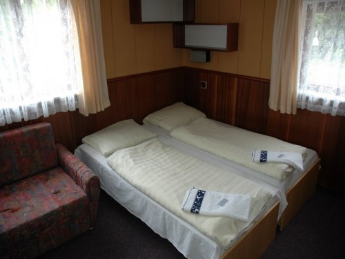 Ubytování nabízí hotel s polopenzí nebo plnou penzí, s celkovou kapacitou 29 lůžek s tímto složením: šest třílůžkových pokojů se sprchovým koutem a umyvadlem, jeden třílůžkový pokoj s přistýlkou, se sprchovým koutem a umyvadlem, jeden dvoulůžkový pokoj se sprchovým koutem a umyvadlem, jeden jednolůžkový pokoj se sprchovým koutem a umyvadlem, jeden čtyřlůžkový s možností jedné přistýlky, se sprchovým koutem a umyvadlem. Společná WC jsou umístěna přímo na patře.