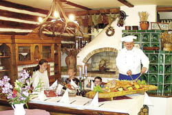 Útulná restaurace s pravou kachlovou pecí, vyhlášenou českou a mezinárodní kuchyní Vám na objednávku připraví i lahůdky jako je pečené sele, sumec, jehně, plněný krocan apod. Mají zde velký výběr vín z českých, moravských a zahraničních sklepů, točené pivo Budvar a Plzeňský Prazdroj. Oddělený salonek je vhodný pro svatby, firemní jednání či rodinné oslavy. Vinárna v netradičním prostředí jeskyně s ohništěm a podzemním jezírkem je k dispozici na objednávku, v sezónních měsících pak o víkendech.