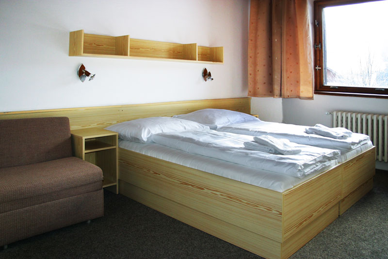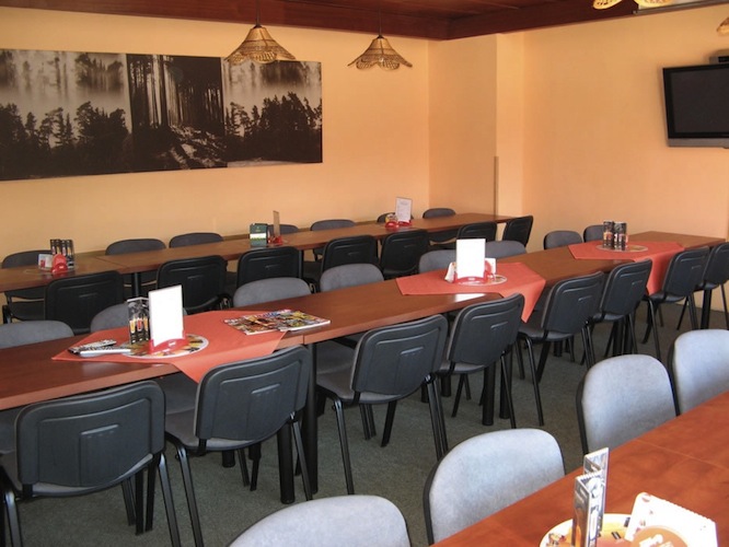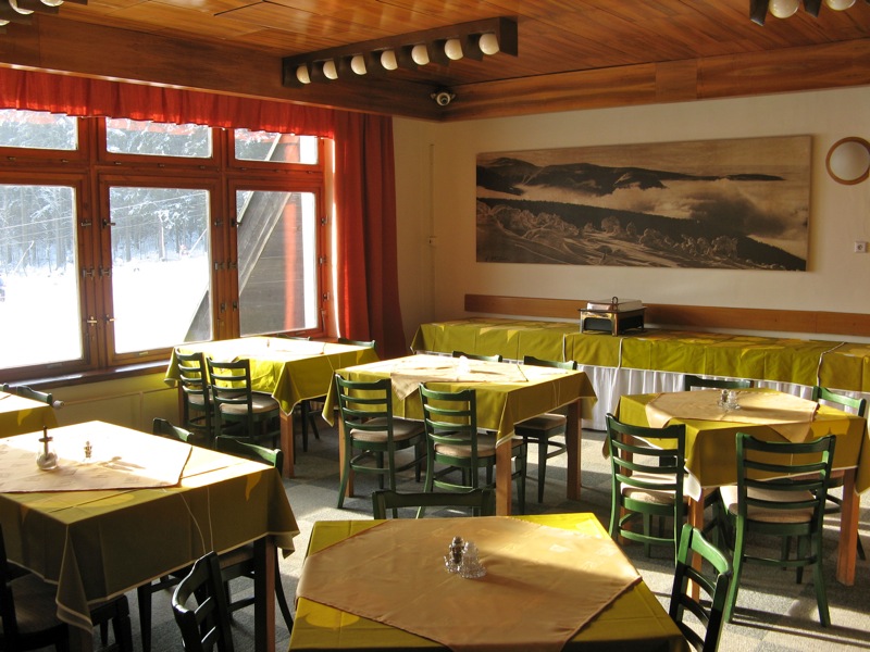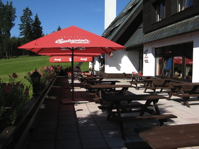 Při hezkém počasí vám můžeme doporučit posezení na venkovní terase s okouzlujícím výhledem na dominantu Harrachova, lyžařské sjezdovky a skokanské můstky.
