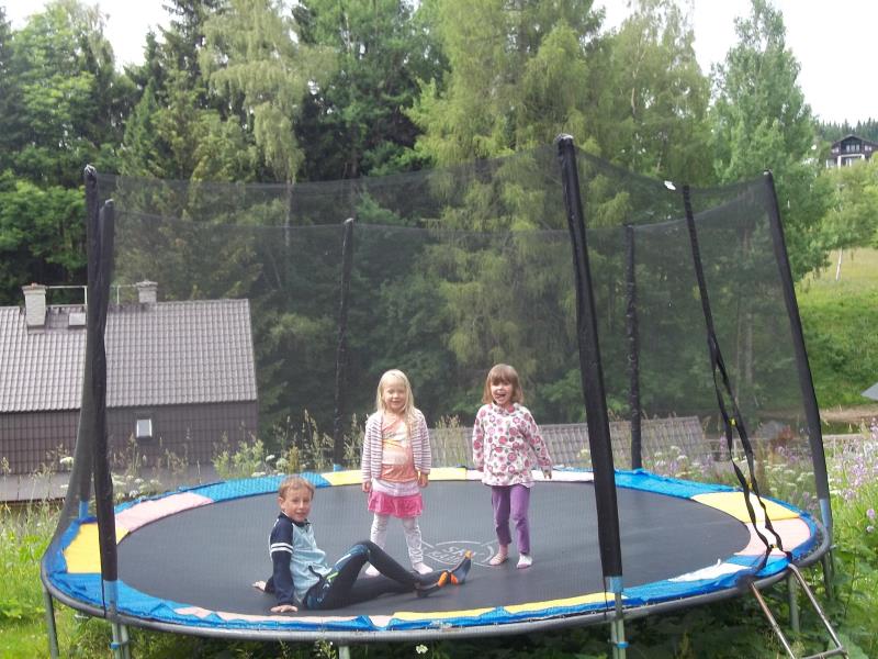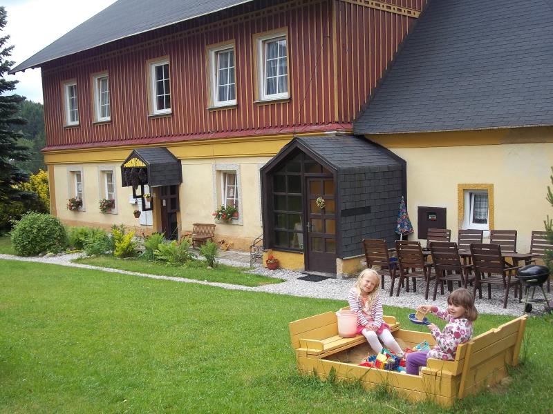 Vedle pensionu Familia je velká zahrada, terasa s grilem, ohniště, pískoviště, houpačky