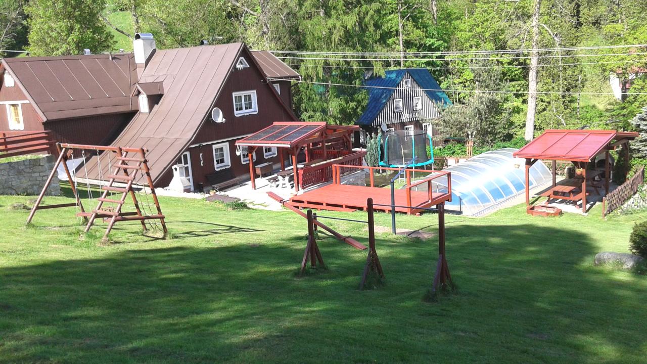 K vybavení patří i prostorná společenská místnost s krbem, WIFI, lyžárna, kolárna, sušárna oděvů, zahrada s venkovním krbem, dětskými prolézačkami, hřištěm, vlastním bazénem a terasou pro chvíle odpočinku.