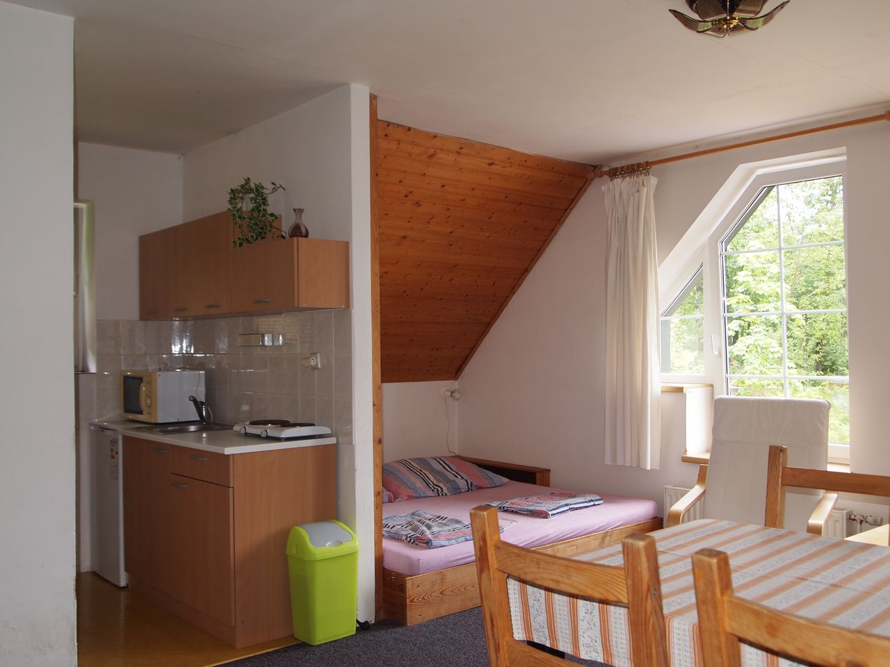 Horní penzionu Niky patro slouží jako tři oddělené čtyřlůžkové pokoje. Dva pokoje mají vlastní sociální zařízení, sprchový kout a kuchyňku vybavenou elektrickým vařičem, rychlovarnou konvicí, kávovarem, lednicí a základním nádobím. Třetí pokoj je možno využít pro větší skupiny nebo rodiny.
