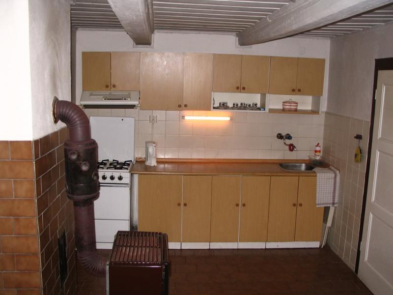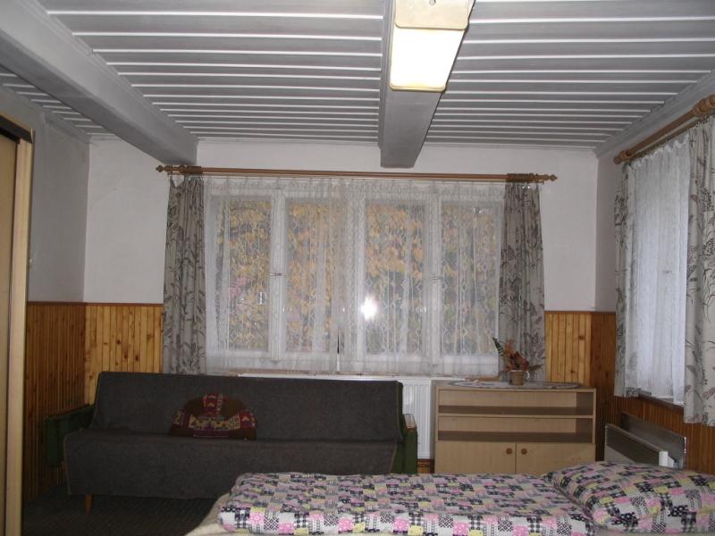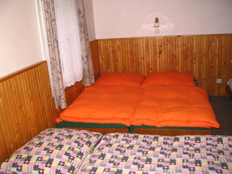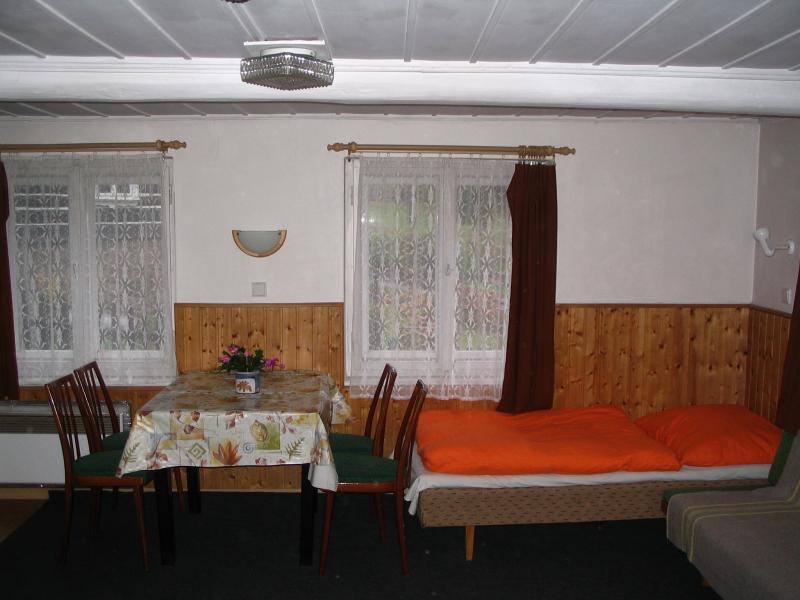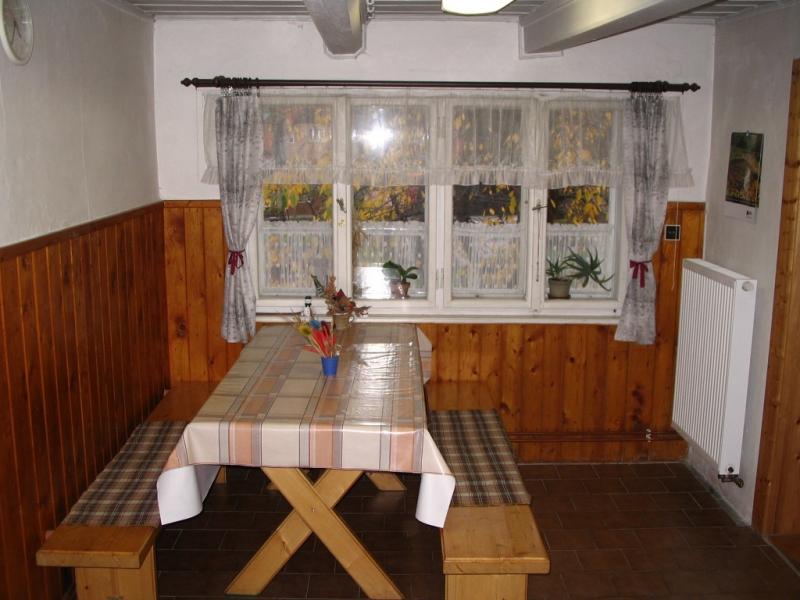 Apartmán 1. - plně vybavená kuchyň s plynovým sporákem a rychlovarnou konvicí a posezení pro osm osob. Pokoj se čtyřmi lůžky s možností dvou přistýlek.